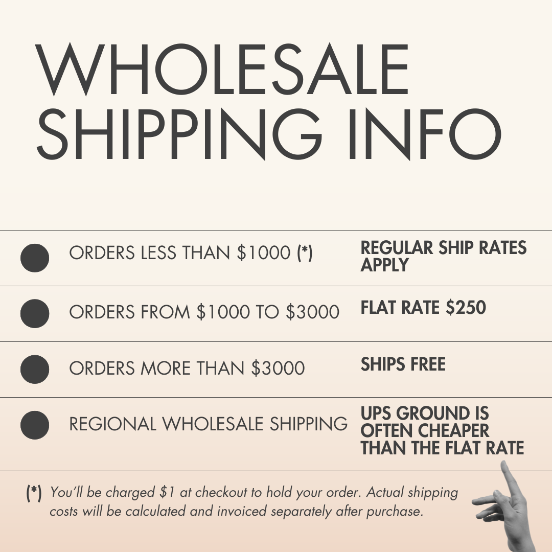 Flat rate is perfect for wholesalers outside our shipping region!) If you’re near us, you can take advantage of UPS Ground shipping for all orders. This custom rate is often cheaper than the flat rate, depending on the size and contents of your order.